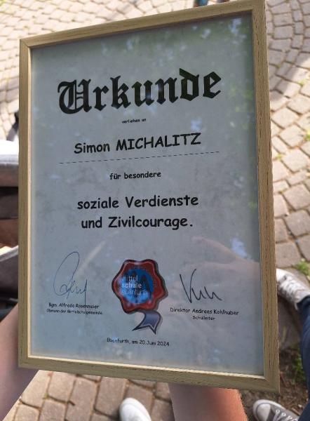 "Ich bin richtig stolz auf Simon, dass er so toll reagiert hat und auch, dass Chrisi ihn so super unterstützt hat", zeigt sich die Mutter Maria Michalitz sichtlich stolz. Simon und Christoph erhielten eine Urkunde für besondere soziale Verdienste und Zivilcourage, unterzeichnet vom Ebenfurther Bürgermeister und dem Direktor der Mittelschule Ebenfurth.
