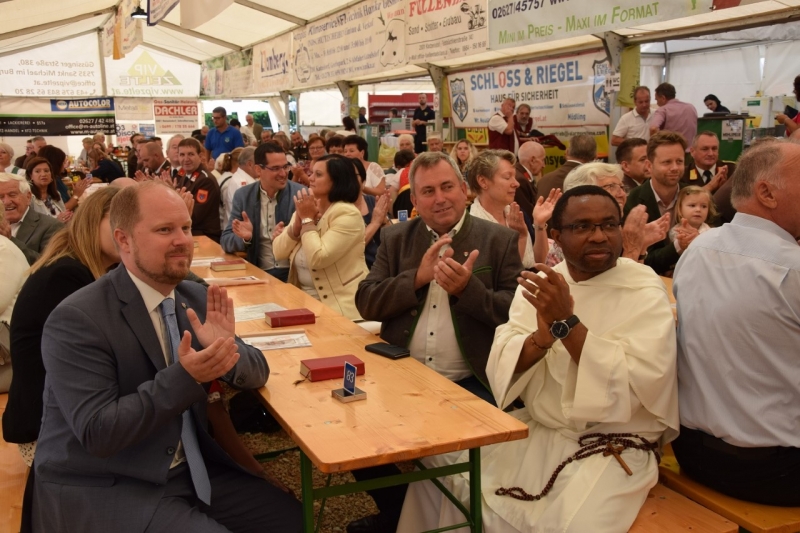 Bedingt durch den Regen musste die Feldmesse zelebriert durch Pater Emmanuel im Festzelt abgehalten werden. Anschließend konnte Kommandant OBI Erwin Woltran eine große Anzahl von Ehrengäste begrüßen: Pater Emmanuel, Bundesrat Martin Preineder, Bürgermeister Michael Nistl, Vizebürgermeister Mag. Stephan ERNST, Damen und Herren des Gemeinderates, Frau Bürgermeister a.D. und Ehrenmitglied der FF Eichbüchl Hannelore Handler-Woltran, OBR Ing. Albert Brix, BR Roland Kleisz, HBI Manfred Landl, ABI Manfred Oberger, EBR Ing. Karl Ofenböck, Bürgermeister Bernhard Karnthaler aus Lanzenkirchen, die Patinnen Helga Woltran, Maria Ofenböck und DI Christa Müller, Abordnungen der Feuerwehren aus Katzelsdorf und den Nachbargemeinden, eine Abordnungen des Kameradschaftsbundes Ortsverband Katzelsdorf/Leitha und für das Rote Kreuz die Familie Doria.
