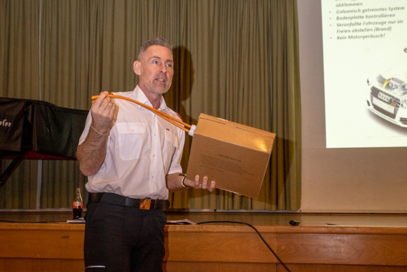 Der Fokus der Schulung lag insbesondere auf den giftigen und ätzenden Abfallprodukten, die beim Brand oder Löschen von Fahrzeugen mit alternativen Antriebsformen entstehen können. Auch der exotherme Brandverlauf eines solchen Batteriebrandes stellte die Einsatzkräfte vor eine große Herausforderung, die durch die zunehmende Verbreitung dieser Antriebssysteme immer realistischer wird. Um für solche Situationen bestens gerüstet zu sein, wurden die Teilnehmer im Umgang mit den technischen Hilfsmitteln der Rettungsdatenbanken, der Rettungskarten sowie der Gefahrgut-Unterlagen geschult. Dadurch können sie im Ernstfall schnell und effektiv handeln.