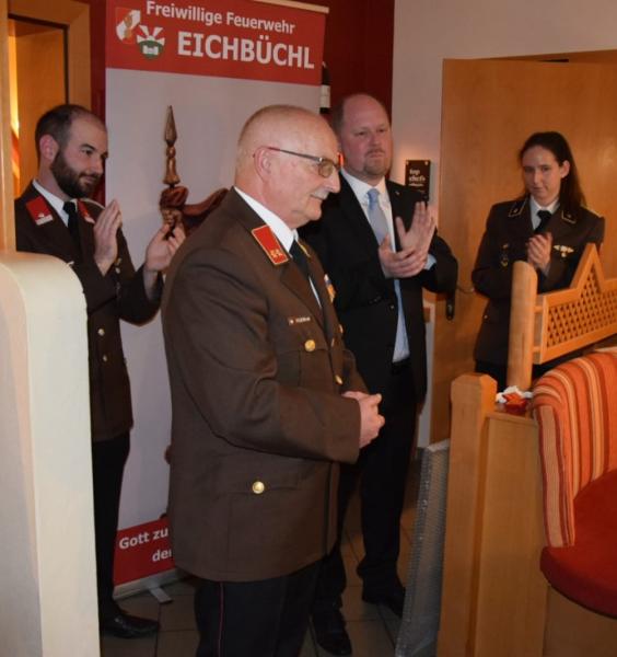 Kommandant OBI Günter Frey bedankte sich in seiner Laudatio bei seinem Vorgänger OBI Erwin Woltran, für sein umfangreiches und erfolgreiches Wirken bei der FF Eichbüchl. Er ist heuer 50 Jahre Mitglied bei der FF Eichbüchl, wovon er 33 Jahre im Kommando (zum Schluss 8 Jahre Kommandant) tätig war. In Würdigung seiner Verdienste wurde er zum Ehrenkommandanten der FF Eichbüchl mit dem Dienstgrad Ehren-Oberbrandinspektor ernannt und mit dem Ehrenring der Feuerwehr ausgezeichnet.