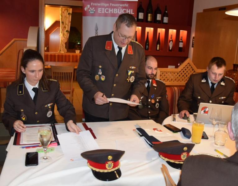 Am 24. Februar 2024 fand die diesjährige Mitglieder- und Wahlversammlung im Restaurant Kupfer-Dachl in Eichbüchl statt. Nachdem Kommandant OBI Erwin Woltran altersbedingt (er wird im Mai 65 Jahre alt und muss zu diesem Zeitpunkt aus dem Aktivdienst ausscheiden) Mitte Jänner seine Funktion als Feuerwehrkommandant bei Bürgermeister Michael Nistl zurückgelegt hat, führte Kommandant-Stellvertreter BI Günter Frey durch die Versammlung.