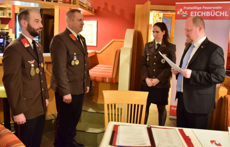 In den Ansprachen würdigten Bürgermeister Nistl und Unterabschnittskommandant Landl das engagierte Wirken der FF Eichbüchl, gratulierten den neuen Funktionären und den jungen Feuerwehr-mitgliedern und wünschten den neuen Ehrenkommandanten alles erdenklich Gute.
