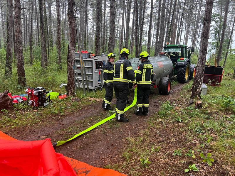 Um die Ausbreitung des Feuers zu verhindern, errichteten sie eine Riegelstellung mit drei D-Rohren und legten einen großflächigen Wundstreifen an. Die Wasserversorgung wurde mit einem mobilen 8000-Liter-Falttank sichergestellt, der von örtlichen Landwirten mit Güllefässern befüllt wurde.