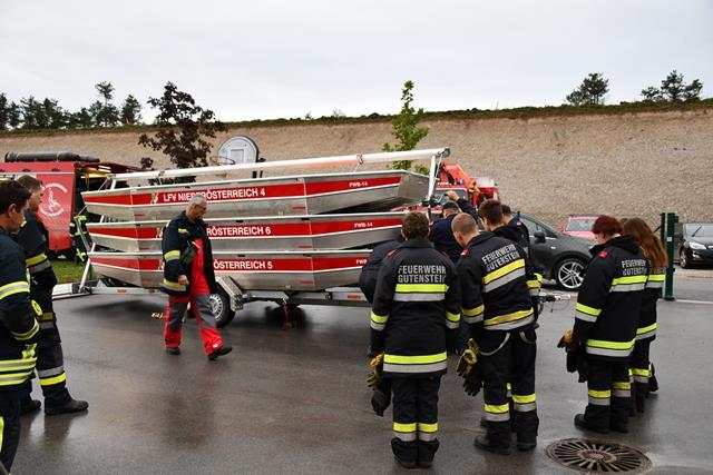 Bei der letzten Station wurde in einem Theorieteil über Dammverteitigung, Dammwache und Dammgebrechen referiert und die Flachwasserboote des NÖ LFV vorgestellt und beübt.