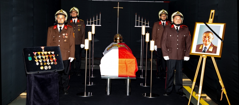 Mit dem Sirenenprogramm FEUER wurde unser Kommandant nach der Aufbahrung im engsten Familienkreis in der Friedhofskapelle zum Grabe geführt, wo ein Trompeter der Eisenbahnermusik ein letztes Stück für Pepi spielte.