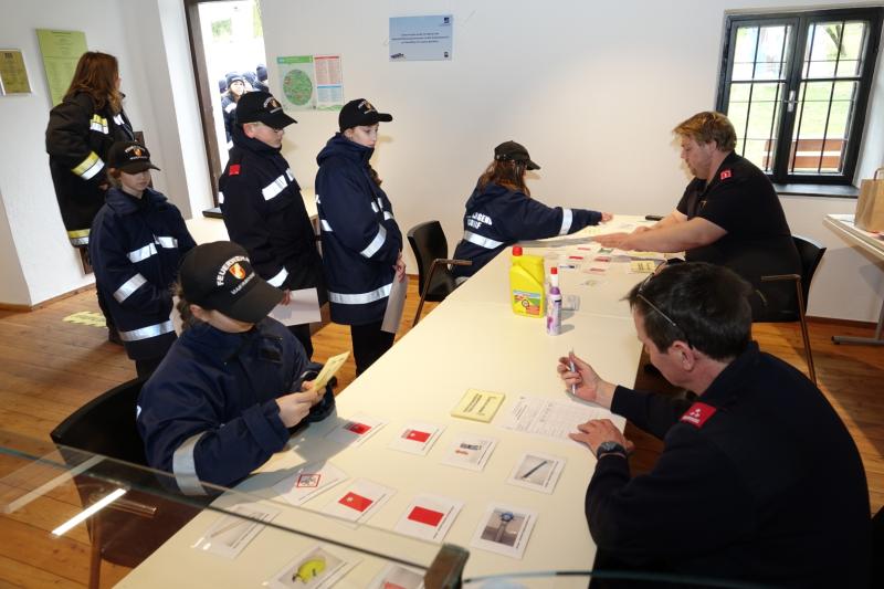 Je nach zu erreichendem Abzeichen gab es die Stationen Testblatt, Kleinlöschgeräte, Geräte für den technischen Einsatz und für den Brandeinsatz, Schutzausrüstung, Dienstgrade, Leinen und Knoten, Zeichen, Handfunkgeräte, das Verhalten im Brandfall und der Umgang mit dem Feuerlöscher.