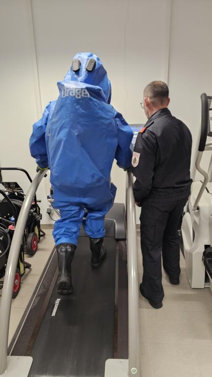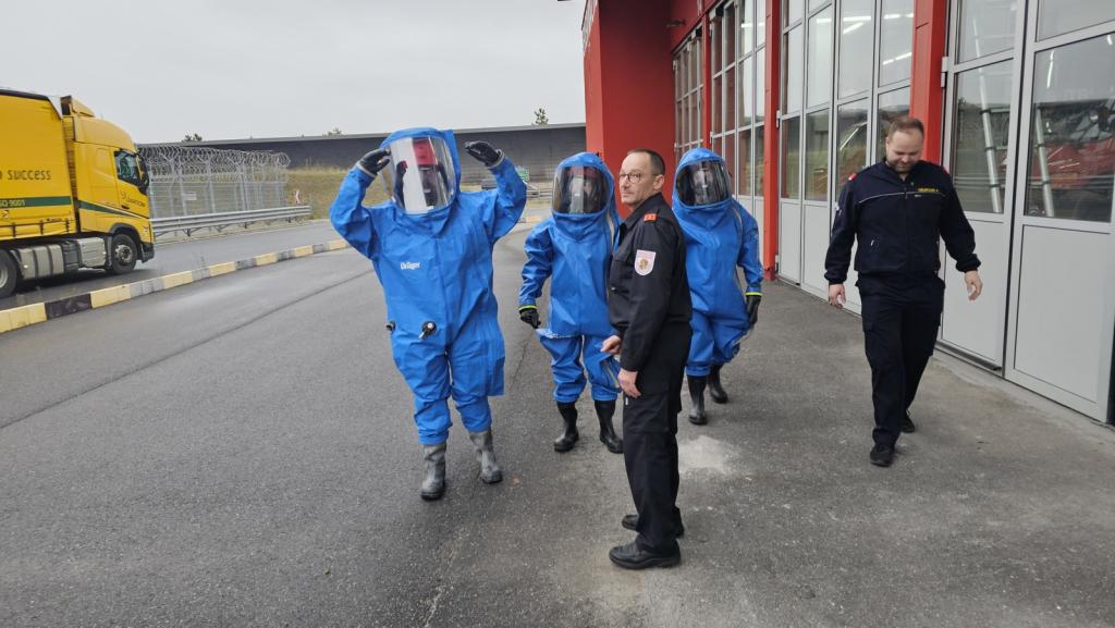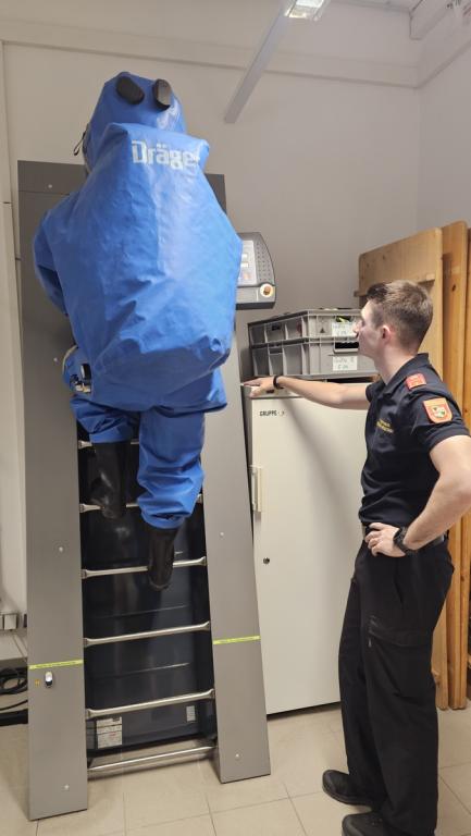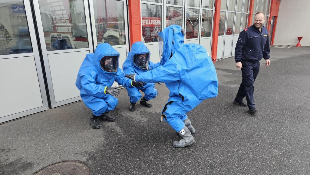 Der Tag begann mit einer theoretischen Schulung am Vormittag, die nahtlos in den praktischen Teil überging. Das Gelernte wurde direkt angewendet: Zunächst überprüften die Teilnehmenden die Schutzanzüge und die Ausrüstung, um anschließend gemäß den Herstellerangaben die Scheiben und Reißverschlüsse für den Einsatz vorzubereiten. Nach einer fordernden Gewöhnungs- und Belastungsübung wurde eine gemeinsame Mittagspause eingelegt. Anschließend folgte ein weiterer kurzer Theorieblock, der sich mit den Schutzanzügen der Schutzstufe 4 (gasdicht und Hitzeschutz) sowie der Fremdluftversorgung befasste.